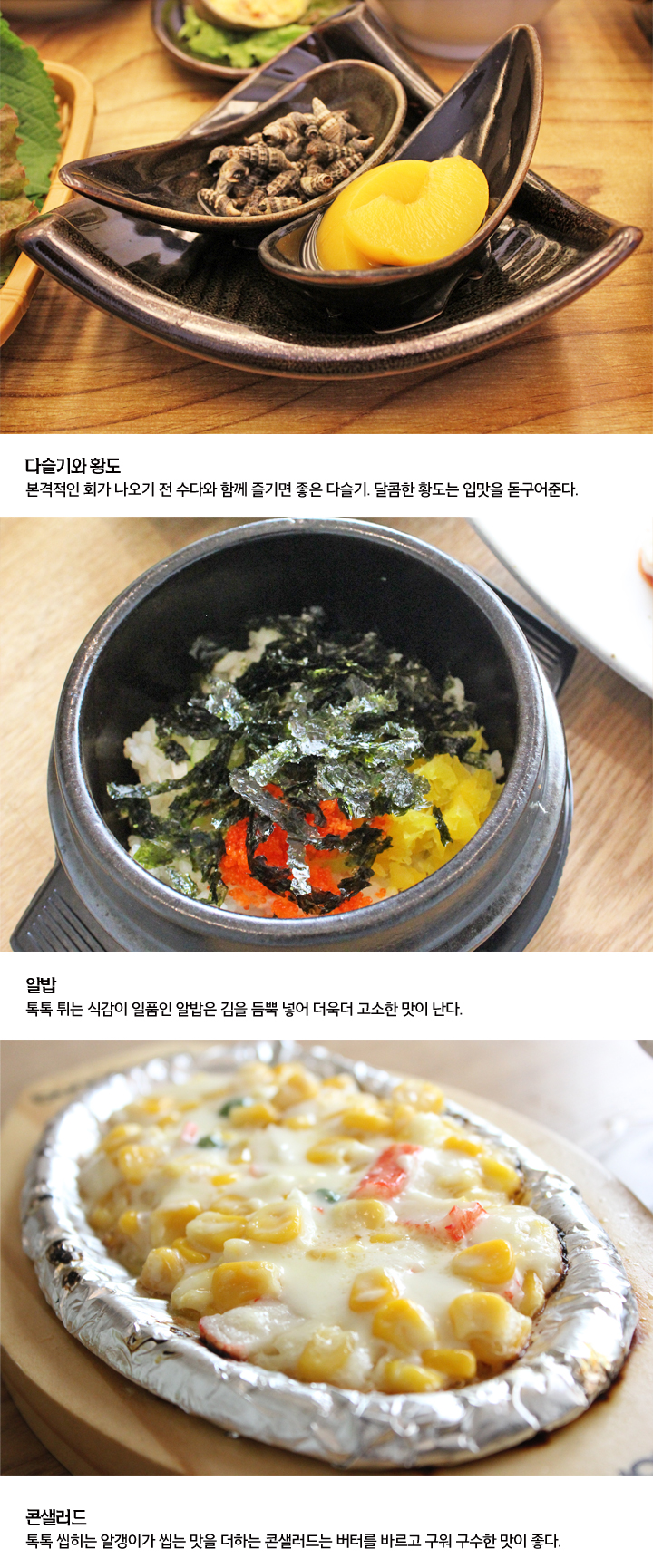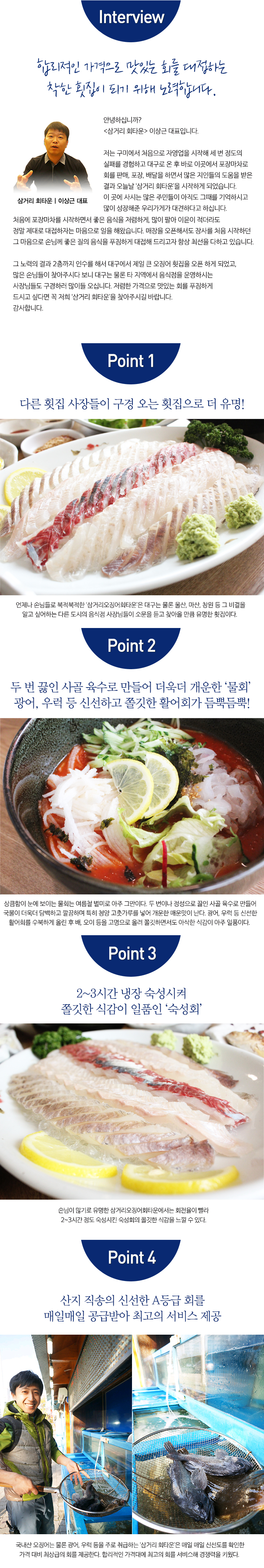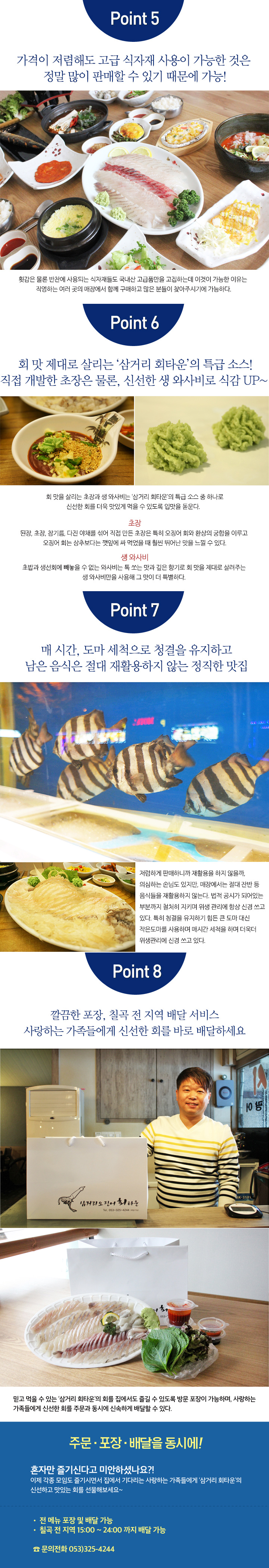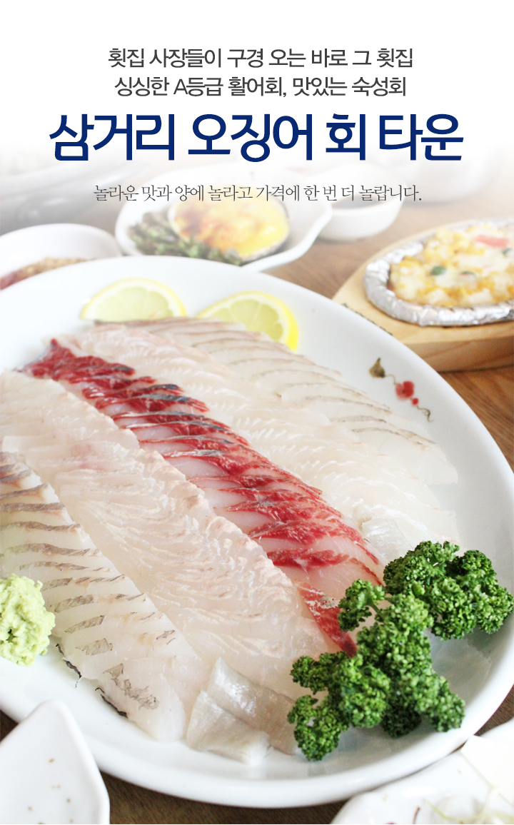횟집사장들이 구경 오는 ‘삼거리오징어회타운’ 싱싱한 A등급 활어회, 맛있는 숙성회는 기본 놀라운 맛과 양, 가격에 한 번 더 놀랍니다 이제 집에서 기다리는 가족들에게도 지금 먹고 있는 신선한 회를 바로 주문해 깔끔한 포장은 물론 신속한 배달로 웃음을 선물하세요~ 데뷰제공 메뉴 삼거리 회 타운 자유이용권 70,000원 Interview 횟집사장들이 구경 오는 횟집으로 더 유명! 가격이 너무 저렴해서 재활용 한다는 오해도.. 구미에서 처음으로 자영업을 시작해서 세 번 정도의 실패를 경험하고 대구로 온 후 바로 이곳에서 포장마차로 회를 썰어서 팔고 포장, 배달을 하면서 오징어를 시작하게 되었습니다. 가진 것은 별로 없었지만 성실하게 열심히 일한 결과 돈 한 푼 없이 많은 지인들의 도움으로 바로 이 자리에 오징어 횟집을 오픈 하게 되었구요. 동네의 많은 분들이 아직도 그때를 기억하시고 많이 성장해준 우리 가게가 대견하다고 하십니다. 처음에 포장마차를 시작하면서 좋은 물건을 싸게, 많이 팔아서 이윤이 적더라도 손님께 정말 제대로 대접하자는 마음으로 일을 해왔습니다. 매장을 오픈해서도 장사를 처음 시작하던 그 마음으로 손님들께 최선을 다하고 좋은 질의 음식을 푸짐하게 대접해 드리고자 항상 최선을 다하고 있습니다. 그 노력의 결과 2층까지 인수를 해서 대구에서 제일 큰 오징어 집을 오픈 하게 되었고, 많은 손님들이 찾아주시다 보니 대구는 물론 타 지역에서 음식점을 운영하시는 사장님들도 구경하러 많이들 오십니다. 현재 오징어와 회를 함께 대접하고 있는데 전체 매출의 70%가 회를 차지하고 있을 만큼 칠곡 에서는 가장 사랑 받는 횟집이라고 자부합니다. 삼거리오징어 대표 | 이상근 Point 1 다른 횟집 사장들이 구경 오는 횟집으로 더 유명! 구암동 1호점의 경우 1, 2층을 운영할 때 손님들이 너무 많아서 대구는 물론 울산, 마산, 창원 다른 도시에서 음식점을 하시는 분들도 소문을 듣고 구경을 오실 만큼 칠곡을 넘어 대구에서도 유명한 횟집 Point 2 깔끔한 포장, 칠곡 전지역 배달서비스 사랑하는 가족들에게 신선한 회를 바로 배달하세요 믿고 먹을 수 있는 ‘삼거리 오징어 회타운’ 의 회를 집에서도 즐길 수 있도록 방문 포장이 가능하며, 사랑하는 가족들에게 신선한 회를 주문과 동시에 신속하게 배달할 수 있다. 전체샷 교체 2014년 → 11월 → 1105(수) 포장용 사진 IMG_0632 주문, 포장, 배달을 동시에! 혼자만 즐기신다고 미안하셨나요?! 이제 각종 모임도 즐기시면서 집에서 기다리는 사랑하는 가족들에게 ‘삼거리오징어회타운’의 신선하고 맛있는 회를 선물해보세요~ • 전 메뉴 포장 및 배달 가능 • 칠곡 전 지역 15:00 ~ 24:00 까지 배달 가능 ☎ 문의전화 053)325-4244 Point 3 2~3 시간 냉장 숙성시킨 숙성회의 참맛 더 쫄깃해서 맛있는 회의 식감 숙성회의 경우 2-3 시간 정도 숙성시켰을 때 맛이 제일 좋다. 4시간 이상이 지나 버리면 선도가 조금씩 변하기 때문인데 이것이 바로 기본적인 손님이 많지 않으면 제대로 된 숙성회를 준비하기 쉽지 않은 이유다. Point 4 산지 직송의 신선한 A등급 회가 매일매일 공급 횟감은 국내산 오징어는 물론 광어, 우럭을 주로 취급하고 매일 매일 신선도를 확인한 가격 대비 최상급의 고기를 제공한다. 비싸고 좋은 회가 아니라 합리적인 가격대에 최고의 회를 서비스하는 것이 바로 경쟁력. Point 5 가격이 저렴해도 고급 식자재 사용이 가능한 것은 정말 많이 판매할 수 있기 때문에 가능! 횟감은 물론 반찬에 사용되는 식자재들도 국내산 고급품만을 고집하는데 이것이 가능한 이유는 직영하는 여러 곳의 매장에서 함께 구매하고 많은 분들이 찾아주시기에 가능하다. Point 6 회 맛 제대로 살리는 ‘삼거리오징어회타운’의 특급 소스! 직접 개발한 초장은 물론, 신선한 생와사비로 식감 업~ 회 맛을 살리는 초장과 생와사비는 ‘삼거리오징어회타운’의 특급 소스 중 하나로 신선한 회를 더욱 맛있게 먹을 수 있도록 입맛을 돋우고 계속 리필이 가능하다. 초장 된장, 초장, 참기름, 다진 야채를 섞어 직접 만든 초장은 특히 오징어 회와 환상의 궁합을 이루고 오징어 회는 상추보다는 깻잎에 싸 먹었을 때 훨씬 뛰어난 맛을 느낄 수 있다. 10월>> 삼거리오징어 폴더>>생와사비 폴더>> 0589 사진 추가 생와사비 초밥과 생선회에 빼놓을 수 없는 와사비는 톡 쏘는 맛과 깊은 향기로 회 맛을 제대로 살려주는 생와사비만을 사용해 그 맛이 더 특별하다. Point 7 매 시간 도마 세척으로 청결을 유지하고 남은 음식은 절대 재활용하지 않는 정직한 맛집 싸게 파니까 재활용을 하지 않을까 의심하시는 분들도 있는데 매장에서 재활용은 없고 법적으로 공시가 되어 있는 부분까지 철저히 지키면서 위생 관리에 항상 신경 쓰고 있다. 또한 큰 도마를 사용하지 않는데 큰 도마는 보기는 좋지만 위생상 청결을 유지하기 힘들기 때문에 작은 도마를 사용하여 매 시간마다 세척을 통해 항상 위생에 신경 쓰고 있다. Point 8 3년 이상 근무한 직원들이 항상 친절하게, 묻지도 따지지도 않고 세 번까지 리필 가능 기본 음식은 3번씩 리필이 될 만큼 음식도 좋고 직원 전원이 서비스 교육을 철