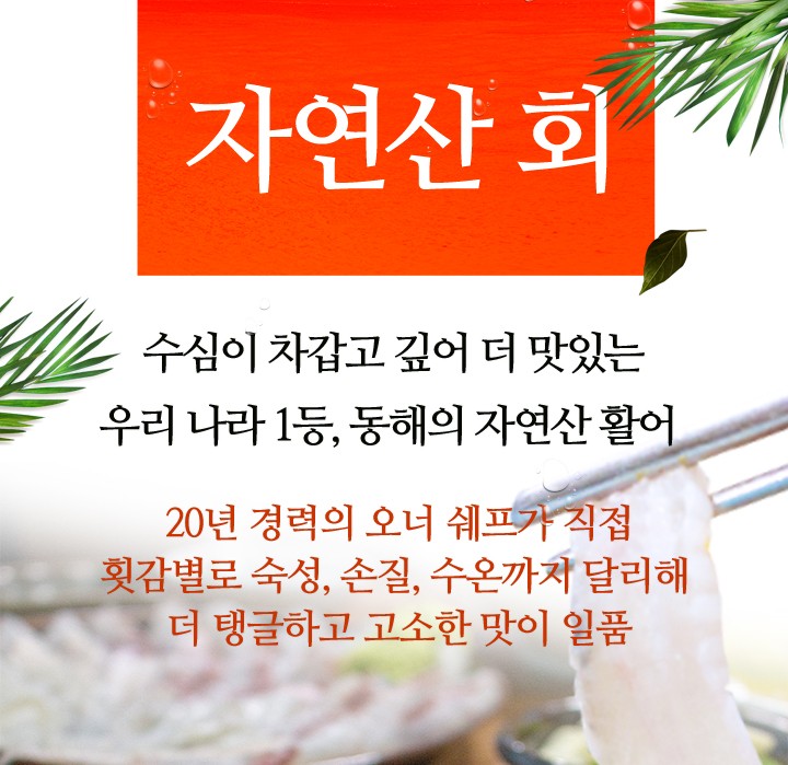 수심이 차갑고 깊어 더 맛있는 우리 나라 1등, 동해의 자연산 활어 20년 경력의 오너 쉐프가 직접 횟감별로 숙성, 손질, 수온까지 달리해 더 탱글하고 고소한 맛이 일품 ’자연산 회’ 체험단의 모든 회는 자연산 입니다. Interview 홍완기 대표 | 자연산회 자연의 건강함을 그대로 담은 갓 잡은 싱싱한 자연산 활어의 진짜 참맛을 느껴보세요!! 안녕하세요? < 자연산 회 > 홍완기 대표입니다. 저희 ‘자연산회’는 우리나라 활어의 본고장인 동해의 살아있는 진짜 자연산 활어를 산지직송으로 공수해와 주문 즉시 바로 손질 후 제공해드리고 있어 전국에서도 가장 신선하고 질 좋은 자연산 회를 맛보실 수 있는 곳입니다. 저는 20년 가까이 일식과 활어 횟집을 운영해오면서 쌓아온 경험과 노하우를 바탕으로 기존의 일반 횟집과는 차원이 다른 횟감의 손질, 숙성 방법을 연구하여 진짜자연산 활어 그대로의 맛을 선보이고 있습니다. 진정성이 담긴 음식을 통해 단순히 이윤을 남기는 목적을 넘어 최고의 음식과 서비스로 고객이 지불하는 금액의 가치를 확실하게 느끼실 수 있도록 최선을 다하겠습니다. Point. 1 우리나라 1등 자연산 활어의 성지 동해 수심이 깊고 차가운 동해의 자연산 활어만을 고집해 더 살점이 탱글하고 담백한 자연산 회! 자연산회는 매장의 이름에서 보듯이 자연산 활어 전문점으로 우리나라 1등 자연산 활어의 성지로 유명한 동해에서 잡은 싱선한 자연산 활어만를 사용한다. 동해는 해안선이 매끈하고 완만하여 뻘이 없으며 수심이 깊고 수온이 차가워 고기의 활동성이 높다. 동해의 자연산 활어는 타 지역의 활어에 비해 육질이 좋고 담백하고 고소해 자연산 활어 중 최고로 손꼽힌다. Point. 2 20년 경력의 활어 전문가, 홍완기 대표! 활어의 종류에 따라 손질도 숙성도 다르게 20년 경력을 자랑하는 활어 전문가 ‘홍완기’대표는 10여년간 일식을 해왔을 뿐만 아니라 7년간 활어 횟집을 직접 운영해온 자타공인 자연산 활어 전문가로 대구지역에서는 최고 수준의 자연산 활어를 선보이고 있다. 지난 20년의 노하우를 바탕으로 횟감을 손질하는 방식 또한 활어의 종류에 따라 물을 사용하는 것과 사용하지 않는 것, 숙성을 하는 등 여러 방식으로 최상의 자연산 회의 맛을 느낄 수 있도록 손질하고 있다. 특히 회를 뜨는 회칼을 매일 관리하여 회를 썰었을 때 활어의 살이 부서지지 않고 매끄러우며 고유의 섬유질이 살아있어 고객의 만족도를 더욱 높이고 있다. 수정 대일 밴드가 붙어 있는 손가락 사진을 삭제 8899 .또는 안보이는 사진으로 수정 손질하는 모습의 얼굴 사진 추가 Point. 3 매일 아침 동해에서 산지 직송되어 팔딱 팔딱 신선함이 제맛인 자연산 활어 고객들에게 더욱 더 신선한 자연산 회를 제공하기 위해 매일 산지에서 직송으로 자연산 활어를 공수 받아 주문 즉시 살아있는 활어를 빠르게 손질해 내놓기 때문에 더욱 쫄깃하고 신선한 회를 맛볼 수 있다. 매일 매일 공수되는 동해의 자연산 활어는 마치 동해상에서 바다바위 속을 유유히 헤엄치는 활어를 낚시로 갓 잡아올린 것 같은 놀라운 신선함으로 일반 양식 활어와는 차원이 다른 육질과 풍미를 자랑한다. Point. 4 자연산 회를 양식회 가격에 부담 없이? 전국 어디에서도 접하기 힘든 ‘갓성비’ 자연산회는 높은 가격 때문에 자연산회를 쉽게 접하기 힘든 고객들을 위해 양식회 수준의 합리적인 가격으로 고객들에게 동해의 신선한 자연산 회를 제공한다. 대구에서는 가장 부담없는 가격으로 자연산 회를 만나볼 수 있으니 진정한 자연산 회의 매력을 느껴보고 싶다면 꼭 자연산회를 찾아가 보도록 하자. 수정 - 추가 된 메뉴판 사진 보내주기로 함 메뉴판 하단에 텍스트 형태로 추가 해주세요 같은 메뉴판의 느낌 이 나도록 첨부부탁드립니다. 추가 이시가리 - 소 80,000 / 중 120,000 / 대 160,000 대방어 - 소 50,000 / 중 70,000 / 대 90,000 이시가리 + 잡어 - 소 60,000 / 중 80,000 / 대 100,000 Point. 5 쫄깃하고, 고소하고, 부드럽고! 우럭, 게르치, 놀래미, 참가자미, 뱅에돔, 홍치 등 10여 종의 먹는 재미가 가득한 자연산 ‘잡어’ 자연산회의 모든 것을 맛본다고 해도 과언이 아닌 ‘잡어’ 메뉴는 자연산 우럭, 게르치. 놀래미. 참가자미. 뱅에돔, 아나고, 홍치, 성대, 고랑치, 장치 등 무려 10여 종의 자연산 활어들을 맛볼 수 있다. 그때 그때 직송되어 오는 활어에 따라 3~4가지 정도의 자연산 잡어를 손님 상에 내어놓는데 다양한 식감과 맛을 맛볼 수 있게 가자미는 세꼬시로, 우럭은 포를 뜨는 등 다양한 방식으로 손질을 해 ‘잡어 ‘메뉴만이 가지는 다양하게 먹는 재미가 솔솔하다. Point. 6 회에서 알알이 육즙이 톡톡 터진다고? 일반 가자미 300마리 잡을 때 1마리 밖에 못 잡는다 자타공인 3대 고급횟감 ‘이시가리’ 자연산 횟감 중 자타공인 3대 고급횟감으로 불리는 ‘이시가리’는 줄가자미라고 불리는 가자미계의 제왕 같은 자연산 활어다. 보통 일반 가자미 300마리가 잡힐 때 1마리가 잡힐 정도로 귀한 횟감으로 일반 가자미에 비해 덩치가 크고 등에 줄무늬가 선명하게 나타나는 것이 특징이다. 보통 세꼬시로 손질해 먹는데 일반 가자미에 비해 고소함이 배