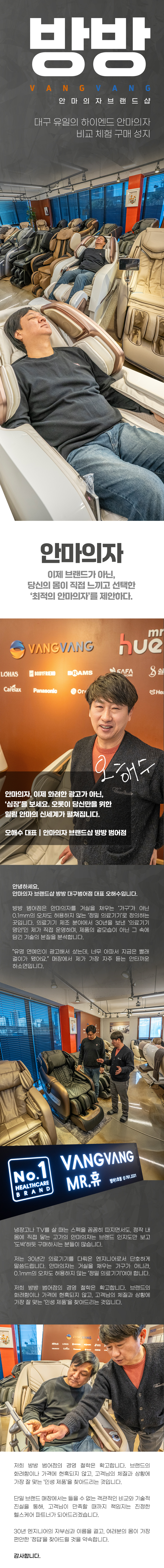 브랜드, 인지도, 가격 거품 다 빼고 진짜 깔끔하게. 30년, 의료기기 엔지니어가 엄선한 10여 가지 브랜드, 30여 종의 제품을 한자리에서 직접 체험하고 비교하라! 대구 유일의 하이엔드 안마의자 비교 체험 구매 성지 방방 안마의자브랜드샵 안마의자, 이제 브랜드가 아닌, 당신의 몸이 직접 느끼고 선택한 최적의 안마의자를 제안하다. Interview 안녕하세요, 안마의자 브랜드샵 방방 대구범어점 대표 오해수입니다. 방방 범어점은 안마의자를 거실을 채우는 가구가 아닌 0.1mm의 오차도 허용하지 않는 정밀 의료기기로 정의하는 곳입니다. 의료기기 제조 분야에서 30년을 보낸 의료기기 명인인 제가 직접 운영하며, 제품의 겉모습이 아닌 그 속에 담긴 기술의 본질을 분석합니다. 유명 연예인이 광고해서 샀는데, 너무 아파서 지금은 빨래 걸이가 됐어요. 매장에서 제가 가장 자주 듣는 안타까운 하소연입니다. 냉장고나 TV를 살 때는 스펙을 꼼꼼히 따지면서도, 정작 내 몸에 직접 닿는 고가의 안마의자는 브랜드 인지도만 보고 도박하듯 구매하시는 분들이 많습니다. 저는 30년간 의료기기를 다뤄온 엔지니어로서 단호하게 말씀드립니다. 안마의자는 거실을 채우는 가구가 아니라, 0.1mm의 오차도 허용하지 않는 정밀 의료기기여야 합니다. 저희 방방 범어점의 경영 철학은 확고합니다. 브랜드의 화려함이나 가격에 현혹되지 않고, 고객님의 체질과 상황에 가장 잘 맞는 인생 제품을 찾아드리는 것입니다. 단일 브랜드 매장에서는 들을 수 없는 객관적인 비교와 기술적 진실을 통해, 고객님이 만족할 때까지 책임지는 진정한 헬스케어 파트너가 되어드리겠습니다. 30년 엔지니어의 자부심과 이름을 걸고, 여러분의 몸이 가장 편안한 정답을 찾아드릴 것을 약속합니다. 감사합니다. 1. 고객의 마음을 꿰뚫어 보는 오해수 대표의 안목 30년, 안마의자와 함께한 방대한 데이터와 전문성으로 소비자의 상황과 체형에 꼭 맞는 정밀 처방을 제안 방방안마의자브랜드샵 범어점 핵심 포인트 엔지니어의 심장 검증 30년 엔지니어 경력을 바탕으로 모터의 내구성과 센싱 기술의 정밀도를 분석해, 10년을 써도 변치 않을 하드웨어가 검증된 제품(Engineers Pick)만을 제안한다. 데이터 기반의 사용자 맞춤 처방 좋은 기계가 누구에게나 좋은 것은 아니다. 고객의 체형, 평소 불편한 부위, 사용 환경(상황), 그리고 구매 목적까지 고려하여 공학적 데이터와 고객의 라이프스타일을 매칭해 드린다. 실패 없는 구매 가이드 남들이 좋다는 제품 이 아니라, 고객의 근육 굴곡과 라이프스타일에 최적화된 제품 을 찾아드림으로써, 구매 후 빨래 걸이가 되는 시행착오를 원천 차단한다. 진정한 헬스케어 파트너 단순히 물건을 파는 장사꾼이 아니라, 엔지니어의 양심으로 고객의 건강 상황에 가장 이로운 기계적 해답을 제시하는 전문가의 자부심을 실천하고 있다. 2. 특정 브랜드를 강요하지 않는 안마의자 검증 연구소 방방 안마의자 브랜드 샵 마케팅이 아닌, 안마의 실력만으로 진검 승부! 10 여개 브랜드와 30여 개의 제품이 한자리에서 일반적인 안마의자 대리점이나 판매점은 매장에 단하나의 브랜드만 보유하고 있기 때문에 자사 제품의 장점만 나열하기 바쁜 경우가 많다. 고객들은 다른 브랜드와 비교를 원하지만 교묘하게 깎아내리거나 정보 자체를 주지 못하거나 주지 않는 경우가 생기곤 한다. 방방 대구범어점은 단 하나의 브랜드를 취급하는 곳이 아닌 후지이료키, 파나소닉, 사파, 브람스, 미아키와 등 국내외 10여 개 브랜드를 한자리에 모은 안마의자계의 멀티 브랜드 편집숍으로, 이곳은 특정 브랜드에 치우치지 않고 오직 고객의 편에 서서 각 브랜드의 장단점을 가감 없이 분석해준다. 그렇기에 방방 범어점의 핵심 경쟁력은 철저한 객관성이라 할 수 있는데, 일본 브랜드의 섬세한 모터 기술부터 한국 브랜드의 강력한 프레임 파워까지, 각기 다른 특성을 가진 제품들을 한자리에서 공정하게 비교할 수 있다. 수많은 광고의 홍수 속에서 어떤 것이 진짜인지 혼란스러운 고객에게, 방방 대구범어점은 올바른 안마의자의 선택을 돕는 가이드이자 기술력 미달 제품을 걸러내는 필터 역할을 톡톡히 해내고 있다. 3.안마의자의 심장을 보지 못하면 껍데기에 속습니다 30년 의료기기 엔지니어의 눈, 겉이 아닌 속을 보다. 안마의자의 본질에 다가가는 방방의 원칙! 고객들은 안마의자 화려한 가죽 색상과 디자인, LED 조명에 눈길을 뺏기기 쉽다. 하지만 이곳, 방방 범어점의 안마의자 라인업은 30년 경력의 의료기기 엔지니어인 오해수 대표가 직접 큐레이팅 하기에 본질 부터가 다르다. 오해수 대표는 단순히 마진이 좋은 제품이 아니라, 모터의 내구성과 프레임의 견고함이 검증된 제품만이 매장의 문턱을 넘을 수 있게 한다. 중국 공장에서 찍어낸 저급한 OEM 제품이나, 모터 밸런싱이 맞지 않아 미세 소음과 진동이 발생하는 제품은 철저히 배제된다. 고객은 복잡한 기계적 지식이 없어도 된다. 이미 엔지니어의 까다로운 기준을 통과한 상위 1%의 제품들만 모여 있기 때문이다. 겉모습은 흉내 낼 수 있어도 10년을 버티는 내구성은 속일 수 없다 는 것이 오