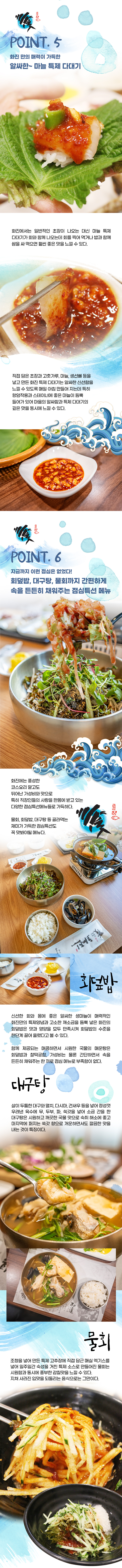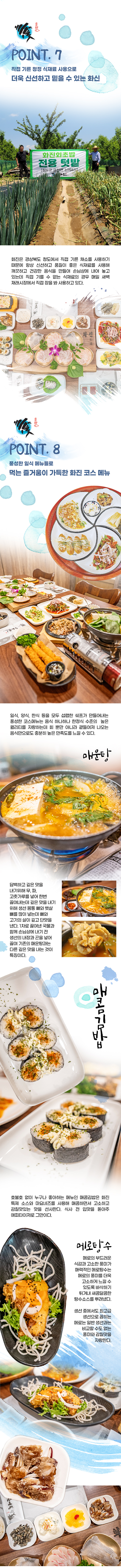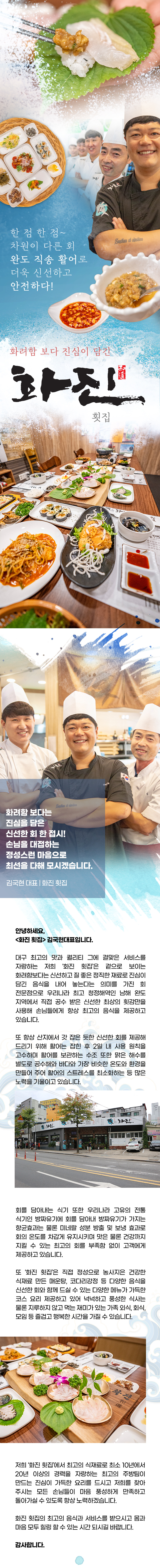 한 점 한 점~ 차원이 다른 회 완도 직송 활어로 더욱 신선하고 안전하다! 화려함 보다 진심이 담긴 화진횟집 화원진천점 김국현 대표 | 화진횟집 화원진천점 화려함 보다는 진심을 담은 신선한 회 한 접시! 손님을 대접하는 정성스런 마음으로 최선을 다해 모시겠습니다. 안녕하십니까, <화진횟집 화원진천점> 김국현대표입니다. 겉으로 보이는 화려함 보다는 신선하고 질 좋은 정직한 재료로 진심이 담긴 음식을 내어 놓는다는 의미를 가진 저희 ‘화진횟집’은 우리나라 최고 청정지역인 남해 완도 지역에서 직접 공수 받은 신선한 횟감만을 사용해 손님들에게 최고의 음식을 제공하고 있습니다. 항상 신선한 회를 제공해 드리기 위해 활어는 잡힌 후 2일내 사용을 원칙을 하고 있습니다. 활어를 보관하는 수조의 경우 맑은 해수를 별도로 공수해와 바다와 가장 비슷한 온도와 환경을 만들어 주어 활어의 스트레스를 최소화해 가장 맛있는 최고의 횟감을 제공해 드리고 있습니다. 저희 ‘화진횟집’은 직접 정성으로 농사지은 건강한 식재료 만든 매운탕, 코다리강정 등 다양한 음식을 신선한 회와 함께 드실 수 있는 다양한 코스 요리로 가족 외식, 회식, 모임 등 즐겁고 행복한 시간을 가질 수 있는 풍성한 메뉴들을 제공하고 있습니다. 저희 ‘화진횟집’에 최고의 식재료로 최고의 쉐프가 만드는 진심이 가득한 요리를 드시고 저희를 찾아 주시는 모든 손님들이 마음 풍성하게 만족하고 돌아가실 수 있도록 항상 노력 하겠습니다. 저희 매장에 방문 하셔서 몸과 마음 모두 힐링 할 수 있는 시간되시길 바랍니다. 감사합니다. Point 1 자연산 도다리. 광어. 우럭. 밀치. 참돔. 감성돔 등 다양하고 싱싱한 활어~! 청정바다 완도 직배송으로 더욱 신선하고 안전하게! 화진횟집에서는 자연산 도다리. 광어. 우럭. 밀치. 참돔. 감성돔 등 총 다양한 종류의 활어를 맛볼 수 있는데 모두 우리나라 최고 청정바다인 완도에서 직배송 받은 것으로 신선함과 안전함을 자랑한다. Point 2 김국현 대표와20년 경력의 베테랑 일식 전문가가 직접 손질해 한 차원 높은 남다른 회 화진횟집은 회 맛집을 운영해오던 김국현 대표가 새롭게 문을 연 가게로 캐나다 유학 등 화려한 커리어를 자랑하는 20년 경력의 베테랑 일식 전문가가 직접 손질해 회의 식감 등이 살아있는 것이 특징이다. 특히 회를 뜨는 회칼을 매일 관리하여 회를 썰었을 때 활어의 살이 부서지지 않고 매끄럽다 그리고 생산 고유의 섬유질이 살아있어 최고의 식감을 자랑한다. 그리고 횟감마다 손질법을 달리하고 회 전용 숙성고 마련해 각 횟감에 맞는 숙성을 통해 숙성을 거친 회를 제공해 각 횟감이 가진 최적의 맛을 선사한다. Point 3 잡은 지 2일내 소진을 원칙으로 항상 최고의 신선함을 자랑하는 활어 회의 생명은 바로 신선함인데 ‘화진횟집’에서는 최고의 신선함을 유지하기 위해 활어를 잡은 후 2일 이내 소진을 원칙으로 하고 있다. 그리고 좀 더 신선한 회를 제공하기 위해 활어를 산지에서 공수 받아 하루정도 잘 관리된 수조에서 하루정도 휴식을 취하게 해 스트레스를 줄여 활어의 신선함을 더욱 살리고 있다. Point 4 레몬 소독된 소나무 원목에 무와 함께 담아내 더욱 위생적이고 품격 있는 화진의 활어 회 레몬과 올리브유로 소독한 소나무 원목으로 된 접시에 직접 기른 무를 얇게 깔아놓고 그 위에 회를 썰어내는데 생 무의 살균작용 때문에 더욱 위생적이고 수분을 머금고 있어 회를 마지막 한 점까지 촉촉하게 유지시켜주어 품격 있고 맛있는 회를 맛 볼 수 있다. Point 5 화진 만의 매력이 가득한 알싸한~ 마늘 특제 다대기 화진에서는 일반적인 초장이 나오는 대신 마늘 특제 다대기가 회와 함께 나오는데 회를 찍어 먹거나 밥과 함께 쌈을 싸 먹으면 훨씬 좋은 맛을 느낄 수 있다. 직접 담은 초장과 고춧가루, 마늘, 생선뼈 등을 넣고 만든 화진 특제 다대기는 알싸한 신선함을 느낄 수 있도록 매일 아침 만들어 지는데 특히 항암작용과 스테이너에 좋은 마늘이 듬뿍 들어가 있어 마을의 알싸함과 특제 다대기의 깊은 맛을 동시에 느낄 수 있다. Point 6 직접 기른 청정 식재료 사용으로 더욱 신선하고 믿을 수 있는 화신 화진은 경상북도 청도에서 직접 기른 채소를 사용하기 때문에 항상 신선하고 품질이 좋은 식재료를 사용해 깨끗하고 건강한 음식을 만들어 손님상에 내어 놓고 있는데 직접 기를 수 없는 식재료의 경우 매일 새벽 재래시장에서 직접 장을 봐 사용하고 있다. Point 7 22가지의 풍성한 일식 메뉴들로 먹는 즐거움이 가득한 화진 코스 메뉴 일식, 양식, 한식 등을 모두 섭렵한 쉐프가 만들어 내는 22가지의 풍성한 코스메뉴는 음식 하나하나 한정식 수준의 높은 퀄리티를 자랑하는데 회 뿐만 아니라 곁들여져 나오는 음식만으로도 충분히 높은 만족도를 느낄 수 있다. 매운탕 담백하고 깊은 맛을 내기위해 무, 파, 고춧가루를 넣어 한번 끓여내는데 깊은 맛을 내기 위해 생선 몸통 뼈와 뱃살 뼈를 많이 넣는데 뼈와 고기의 살이 깊고 단맛을 낸다. 1차로 끓여낸 국물과 함께 손님상에 내기 전 생선의 내장과 곤을 넣어 끓여 기존의 매운탕과는 다른 깊은 맛을 내는 것