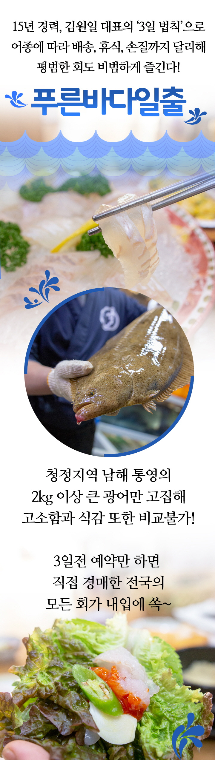 20년 경력, 김원일 대표의 ‘3일 법칙’으로 어종에 따라 배송, 휴식, 손질까지 달리해 평범한 회도 비범하게 즐긴다! 청정지역 남해 통영의 2kg 이상 큰 광어만 고집해 고소함과 식감 또한 비교불가! 3일전 예약만 하면 직접 경매한 전국의 모든 회가 내입에 쏙~ 푸른바다일출 데뷰 제공 메뉴 모듬회 + 자연산회 + 주류 1병(소주, 맥주 택 1) 총 9만원 상당 Interview (# 대표사진) 김원일 대표 | 일출횟집 지금까지 동네에서는 보지 못했던 베테랑 전문가가 손질한 차원이 다른 정통 활어회로 여러분의 마음을 채워드리겠습니다. 안녕하세요? <푸른바다일출> 김원일대표입니다. 저희 ‘푸른바다일출’은 고급 일식 전문점 보다는 가까운 동네에서도 저렴한 가격에 높은 퀄리티의 질 좋은 회를 부담없이 제공하고자 문을 열었습니다. 우리나라 최고 청정지역인 남해 통영에서 직접 공수 받은 신선한 횟감만을 사용해 동네에서는 맛보기 힘든 높은 신선도와 맛의 회를 제공하고 있습니다. 항상 신선한 회를 제공해 드리기 위해 활어는 잡힌 후 3일내 사용을 원칙으로 합니다. 또한 활어를 보관하는 수조는 항상 맑은 해수를 별도로 공수해와 바다와 가장 비슷한 환경을 만들어 주기 때문에 활어의 스트레스가 최소화 되어 가장 맛있는 최고의 횟감의 제공이 가능 합니다. 부담스러운 고급 일식 전문점이 아닌 동네의 편안한 횟집인 ‘푸른바다일출’에서 15년 경력의 전문 일식 쉐프가 만드는 진심이 담긴 수준 높은 요리를 드시고 여러분 모두가 행복해 지시기를 바랍니다. 감사합니다. Point 1 청정바다 통영에서 갓 잡아올린 힘이 넘치는 활어! 산지 직배송으로 바다의 신선함을 고스란히 접시에 가득 담아낸 감동의 활어회! 푸른바다일출에서는 남해에서 온 신선한 광어, 우럭부터 동해에서 잡힌 감성돔 등 다양한 자연산회까지 전국의 모든 바다에서 잡히는 다양한 종류의 활어를 모두 맛볼 수 있다. 특히 광어와 우럭은 우리나라 최고 청정바다인 통영에서 산지 직배송 받은 것을 사용해 바다의 신선함을 고스란히 담고 있어 최고의 맛과 식감을 자랑한다. Point 2 일식에서만 15년 이상 경력의 김원일 대표가 횟감에 맞춰 다르게 썰어내 식감이 남 다르다! 일출 횟집은 수성구에서도 유명한 금강횟집 등 일식분야에서만 15년간 경력을 쌓은 베테랑 일식 전문가인 ‘김원일 대표’가 주인장이다. 대표가 직접 각종 활어의 다른 특성에 맞춰 결을 살려 썰어내기 때문에 회의 식감이 살아있어 더욱 맛있다. 특히 회칼을 정말 꼼꼼하게 관리하여 회를 썰었을 때 활어의 살이 부서지지 않고 매끄럽고 활어 고유의 섬유질이 살아있어 한입 먹었을 때 각 활어 특유의 식감을 느낄 수 있다. Point 3 최고의 회 한점을 위한 약속! 배송, 휴식, 손질, 신선한 활어를 위한 푸른바다일출 김원일 대표의 ‘3일의 법칙’ 좋고 맛있는 회의 생명은 바로 신선함이라고 할 수 있는데 ‘푸른바다일출’에서는 최고의 신선함을 유지하기 위해 활어가 입고 된 후 1일 배송, 1일 휴식, 1일 손질, 총 3일 이내 소진을 원칙으로 하고 있다. 신선함 뿐만 아니라 활어가 가진 최적의 맛을 회를 제공하기 위해 활어를 산지에서 공수 받아 잘 관리된 수조에서 하루정도 휴식을 취하고 스트레스를 줄이는 과정을 통해 활어의 맛을 더욱 살리고 있다. Point 4 마지막 한점까지 촉촉하게 즐긴다! 원형접시에 고급스럽게 내려앉은 품격이 살아있는 푸른바다일출의 남다른 활어 회 ‘푸른바다일출’의 회는 맛은 물론 눈으로 보는 맛으로도 입맛을 자극시킨다. 화려하게 장식된 원형접시에 깨끗한 한천을 도톰하게 깔아 성을 쌓고 그 위에 정갈하게 썰어낸 회를 꽃잎이 내려앉은 듯 담아낸 모습은 고급 일식당에 온 것 같은 느낌을 준다. 또한 눈에 보이는 아름다움 뿐만 아니라 아래에 깔린 한천이 수분을 머금고 있어 회를 마지막 한 점까지 촉촉하게 유지시켜주어 품격 있고 맛있는 회를 맛 볼 수 있다. Point 5 어종에 따라 잡는 방법, 먹는 타이밍과 숙성과정을 달리한 섬세한 활어손질 이것이 바로 소문난 회 맛집의 비결이다! 소문난 회 맛집은 비결은 바로 고객을 위한 섬세하고 정성이 들어간 횟감의 손질 방법이 좌우한다고 볼 수 있다. 활어를 잡을 때 물을 전혀 쓰지않는 등 각 횟감에 따라 특유의 식감과 맛을 살리는 손질 방법을 적용해 회의 본연의 살아있는 식감과 맛을 최대한 살리고 있다. 광어의 경우 손님상에 내어 놓기 전 회 전용 숙성고에서 2시간의 저온 숙성과정을 거쳐 더욱 쫄깃하고 쫀득한 최적의 회를 즐길 수 있도록 손질하고 있다. Point 6 지금까지 먹은 광어는 광어가 아니였다? 먹는 식감과 고소함부터 다른 ‘2Kg 이상’ 큰~광어! 아따 맛나네~ 광어는 크기에 따라 식감과 고소함 등 여러부분에서 많은 차이가 나는데 작은 광어에서는 큰 광어가 가진 지느러미 살 특유의 고소함과 식감을 느끼기가 힘들다. 푸른바다일출에서는 최고의 광어의 맛을 고객들에게 선보이기 위해 2kg 이상의 큰 광어만을 사용하는데 2kg이상의 큰광어는 작은 광어에 비에 살이 두껍고 식감과 고소함이 월등히 뛰어나 비교가 불가할 만큼 환상적인 맛을 자랑한다. Point 7 말씀만 해주이소~