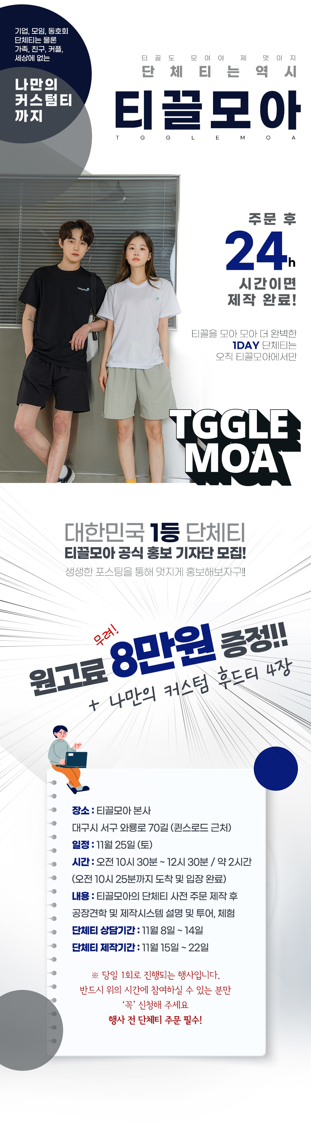 기업, 모임, 동호회 단체티는 물론 가족, 친구, 커플, 세상에 없는 나만의 커스텀티 까지 세상의 모든 티를 모아 모아 티끌모아 주문 후 24시간이면 제작 완료! 티끌 하나 없이 완벽한 1DAY 단체티는 오직 티끌모아에서만 Interview 티끌모아 최동영 대표, 김도연 실장 티끌모아에서 누구보다 빠르게 아무도 만나보지 못했 던 나만의 하나뿐인 커스텀 티셔츠를 만나보세요! 안녕하세요? 대한민국 최대, 최고의 단체 의류 전문 기업 티끌모아 최동영 대표입니다. 저희 티끌모아는 자타 공인 우리나라 최대, 최고의 단체 의류 전문 기업으로 가장 흔하게 접하실 수 있는 티셔츠부터 점퍼, 근무복, 액세서리, 반려동물의 옷까지 세상의 모든 옷과 다양한 인쇄 기술을 통해 나만의 커스텀 된 옷을 만나보실 수 있는 곳입니다. 티끌모아는 우리나라 제1의 섬유, 패션 도시인 대구에서 30년 넘는 시간 동안 의류 업계를 이끌어온 대구 대표 의류 기업인 PERPITTY&TWOROY의 장인 정신과 축적된 노하우를 이어 받은 청년들이 2016년 새롭게 문을 연 공간으로 단체 의류 업계에서는 독보적인 인쇄 시설과 제품 제작 공정 노하우 그리고 누구보다 젊고 창의적인 기업정신을 가지고 있습니다. 30년의 장인 정신을 계승하는 것은 물론 젊은 피를 도전적이고 창의적인 정신을 수혈해 더욱 발전시켜 고객을 위한 정도 경영은 물론 기존의 제작 공정을 더욱 발전시키고 확대해 단체 의류 전문 기업 중에서는 몇 안 되는 일원화된 최첨단 자동 제품 제작 공정을 구축하여 기존기성세대부터 MZ 고객까지 모두 만족하는 고객만족도 200%를 실현하였습니다. 티끌모아는 단순한 단체티, 의류를 넘어 제품에 고객의 이야기를 담고 그를 통해 고객의 시간을 행복한 추억으로 만들고 사람과 사람을 이어주는 매개체로 남으려 합니다. 소중한 사람들과 특별한 시간이 필요할 때 모두를 이어주는 역할을 티끌모아가 함께 할 수 있도록 항상 노력하고 또 노력하겠습니다. 감사합니다. chapter 1 ABOUT TGGLEMOA 장인의 검증된 탄탄한 기술에 MZ의 독창적인 생각을 더해 고객의 상상을 현실로 만드는 그것이 바로 티끌모아 티끌모아는 자체적으로 편직, 원단, 염색, 가공, 재단, 봉제부터 나염, 전사, 자수 등 인쇄까지 단체티 제작의 모든 공정 노하우와 제작 설비 시설을 갖춘 전직원이 20~30대의 MZ 세대로 구성된 ‘전국 유일의 단체티 전문 MZ 기업입니다’ chapter 2 The Philosophy of Tgglemoa ‘티끌모아의 철학’ 너와 나를 우리로 만들어주는 ‘티끌모아’ 티끌모아는 단순한 옷이 아닌 옷을 입고 마주할 여러분들의 소중한 시간이 아름다운 추억으로 남기 위한 도구로 마음껏 활용되길 바라는 간절한 마음으로 한 장의 추억을 만들어냅니다. 단순한 티셔츠가 아닌 사람과 사람을 이어주는 징검다리 바로 티끌모아의 철학입니다. chapter 3 The History of Tgglemoa ‘티끌모아의 역사’ 티끌모아는 우리나라 최고의 섬유, 패션 도시인 대구의 대표 의류 업체인 PERPITTY&TWOROY의 경영철학과 노하우 그리고 장인 정신에 청년의 젊고 패기 있는 창의적인 생각을 더해 역사와 전통을 지키고 세대와 세대를 이어가는 공간으로 지난 30여 년의 시간을 넘어 100년의 시간을 바라보는 국내 최대, 최초의 단체 의류 전문 기업입니다. PHILOSOPHY + HISTORY 고객만족 고객신뢰 고객우선 티끌모아는 3가지의 고객 정신에 30년의 시간을 넘어 100년을 바라보는 청년의 땀이 녹아있는 노력을 더해 티끌모아만의 헤리티지를 만들어냈습니다. 30 years + new generation = TGGLEMOA HERITAGE ‘티끌모아의 유산’ chapter 4-1 WHY TGGLEMOA ‘왜 티끌모아인가?’ 티끌모아는 제품 생산, 디자인, 인쇄, 검수 등 주문부터 고객에게 제품이 전달되기까지의 모든 과정이 외주가 아닌 자체 공장에서 이루어지기 때문에 일반 업체들에 비해 납기일이 빠르며 특이 상황 발생 시 신속한 대처가 가능합니다. 제품의 생산부터 디자인, 인쇄, 검수까지 한곳에서 이루어지는 단체티 제작 업체는 티끌모아가 유일합니다. ONLY one DAY ‘오직 티끌모아에서만’ 티끌모아는 업계 최대 규모의 최신식 자동화 기계 도입과 차원이 다른 유니티화된 제품 생산공정, 품질인증 시스템으로 단체티 업계에서는 유일하게 원데이 대량 단체티 주문이 가능합니다. 단체티 업계 유일, 최대의 규모의 자동화 인쇄 시스템 수동이 아닌 자동 시스템이라 실수 없이 더 빠르고 더블 코팅이라 더 선명하고 더 튼튼하게 티끌모아의 인쇄 시스템은 끊임없는 R&D를 통해 사람 손으로 진행하는 수동 인쇄가 아닌 디지털로 계산된 자동화된 최신 인쇄 시스템 구축해 티끌모아만의 인쇄 노하우로 오류 없이 균일하며 빠른 인쇄가 가능합니다. 나염 인쇄의 경우 더 높은 고객만족도를 위해 추가 금액 없이 더블 코팅이 기본적으로 진행되어 더욱 선명하고 내구성이 높은 결과물을 만나볼 수 있습니다. 무조건 한번 더! 더블 코팅이 기본인 곳은 오직 ‘티끌모아’뿐 chapter 4-2 세상의 모든 티에 세상의 모든 인쇄를 더하다. 티끌모아는 티셔츠, 점퍼, 조끼, 근무복부터 모자, 액세서리, 아동 및 반려동물까지 착용 환경과 목적에 맞는 다양한 핏과 기능을 가진 30여 가지 카테고리의 수백 종이 넘는 다양