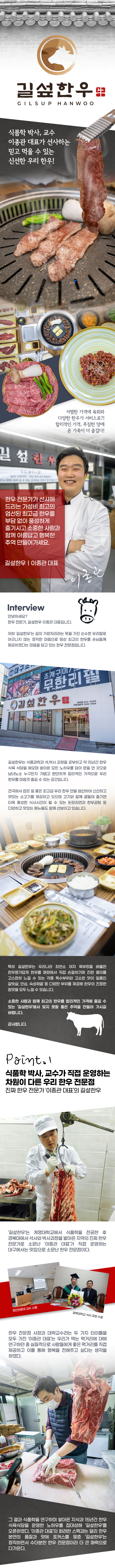 식품학 박사, 교수인 이종관 대표가 직접 골라 더 믿을수 있는 우리 한우! 진짜 한우 전문가가 선사하는 차원이 다른 맛과 풍미! 길섶한우 저렴한 가격에 육회와 다양한 한우가 서비스로?! 합리적인 가격, 푸짐한 양에 온 가족이 더 즐겁다! 데뷰 제공 메뉴 길섶한우 10만원 자유이용권 Interview # 길섶한우 I 이종관 대표 한우 전문가가 선사해 드리는 가성비 최고의 엄선된 최고급 한우를 부담 없이 풍성하게 즐기시고 소중한 사람과 함께 아름답고 행복한 추억 만들어가세요. 안녕하세요? 한우 전문가, 길섶한우 이종관 대표입니다. 저희 ’길섶한우’는 길의 가장자리라는 뜻을 가진 순수한 우리말로 어긋나지 않는 정직한 마음으로 항상 최고의 한우를 손님들께 제공하겠다는 마음을 담고 있는 한우 전문점입니다. 길섶한우는 식품과학과 석,박사 과정을 공부하고 약 10여 년간 한우 식육 식당을 해오며 쌓아온 모든 노하우를 담아 문을 연 곳으로 남녀노소 누구든지 가볍고 편안하게 합리적인 가격으로 우리 한우를 마음껏 즐길 수 있는 공간입니다. 대구, 경북 등지에서 잡은 질 좋은 최고급 우리 한우 만을 엄선하여 신선하고 맛있는 소고기를 제공하고 있으며 고기와 함께 곁들여 즐기면 더욱 풍성한 식사시간이 될 수 있는 된장라면과 한우곰탕 등 다양하고 맛있는 메뉴들도 함께 선보이고 있습니다. 특히 우리나라 최연소 여자 육부장이 섬세하게 손질한 길섶한우는 진한 풍미를 고스란히 느낄 수 있는 각종 특수부위와 고소한 맛이 일품인 갈빗살, 안심, 숙성채끝 등 다양한 부위를 제공해 한우의 진정한 참맛을 모두 느낄 수 있습니다. 소중한 사람과 함께 최고의 한우를 합리적인 가격에 즐길 수 있는 ‘길섶한우’에서 잊지 못할 좋은 추억을 만들어 가시길 바랍니다. 감사합니다. Point 1 식품학 박사, 교수가 직접 운영하는 차원이 다른 우리 한우 전문점 진짜 한우 전문가 ‘이종관 대표’의 길섶한우 ‘길섶한우’는 계명대학교에서 식품학을 전공한 후 경북대에서 석사와 박사과정을 밟아온 지역의 진짜 한우 전문가로 소문난 ‘이종관 대표’가 직접 운영하는 대구에서는 소문난 한우 전문점이다. 한우 전문점 사장과 대학교수라는 두 가지 타이틀을 모두 가진 ‘이종관 대표’는 우리가 먹는 먹거리에 대해 연구하던 중 실질적으로 사람들에게 좋은 먹거리를 직접 제공하고 이를 통해 행복을 전해주고 싶다는 생각을 하였다. 그 결과 식품학을 연구하며 쌓아온 지식과 10년간 한우 식육식당을 운영한 노하우를 집대성해 ‘길섶한우’를 오픈하였다. ‘이종관 대표’의 화려한 스펙과는 달리 한우 본연의 품질과 맛에 포커스를 맞춘 ‘길섶한우’는 정직하면서 수더분한 한우 전문점이라 더 큰 매력으로 다가온다. Point 2 한우 전문점 10년의 노하우로 전국에서 선별한 최상급 우리 한우 도축 일로부터 빠르게 소진되는 신선한 암소라 육질이 부드럽고 육즙이 가득! ‘길섶한우’는 ‘이종관 대표’의 수준 높은 식품학 지식과 10년간 한우 식육식당을 운영한 경험을 바탕으로 천안과 음성 등 최고 품질의 좋은 한우를 찾기 위해 어느 한 지역이 아닌 전국 각지에서 잡은 최고 한우를 직접 선별해 가져와 사용하는데 도축 일로부터 오래되지 않은 신선한 한우 암소만을 제공한다. 최고 수준의 고기 전문가가 직접 고기를 눈으로 보고 선별해 가져와 더욱 믿을 수 있을 뿐 아니라 도축한지 3일이 넘지 않은 신선한 한우 암소라 누린내가 없고 육질이 부드럽고 육즙이 가득해 구워 먹었을 때 풍부한 육즙과 함께 부드러운 식감까지 전해져 진정한 한우 본연의 맛을 고스란히 느낄 수 있다. Point 3 질 좋은 우리 한우를 삼겹살 가격에 판다?! 배부르게 먹어도 부담 없는 합리적인 가격 푸짐해서 즐겁고 저렴해서 한 번 더 즐겁다! 최고 품질을 한우를 합리적인 가격으로 편안하고 푸짐하게 드실 수 있도록 하는 것을 가장 최우선으로 한다는 ‘길섶한우’는 유통마진을 최소화하고 경매장에서 고객에게 공급할 수 있는 최적의 한우를 ‘이종관 대표’가 직접 선별해 가져오기에 좀 더 경쟁력 있는 가격으로 고객들에게 최고급 한우를 공급할 수 있다. ‘길섶한우’는 수입산이 아닌 고품질의 우리 순수 한우를 삼겹살 수준의 합리적인 가격에 마음껏 즐길 수 있기에 각종 모임 및 회식, 가족 모임 등 소중한 사람들과 함께 알찬 식사를 즐기려는 분들의 많은 사랑을 받고 있다. 길섶한우를 더 저렴하게 즐기는 법 합리적인 가격을 자랑하는 ‘길섶한우’에는 매장에서의 식사뿐 아니라 매장 내 식육점을 별도로 운영해 매장에서 판매하는 가격 보다 더 저렴하게 질 좋은 한우를 구매할 수 있다. 매장에서 맛 좋은 한우를 푸짐하게 즐기고 가족들 위해 포장해가는 것도 좋다. Point 4 맛 좋은 한우, 한 마리를 오롯이 즐긴다! 특수부위부터 부드러운 갈빗살, 육향이 좋은 숙성 채끝까지 취향에 따라 입맛에 따라 종류별로 골라 먹어 남녀노소 모두 즐거운 ‘길섶한우’ 한우의 모든 것을 오롯이 즐길 수 있는 ‘길섶한우’는 한우가 가진 모든 맛을 고객들에게 선사하게 위해 특수부위, 갈빗살, 안심, 숙성채끝 등 한우를 부위 별로