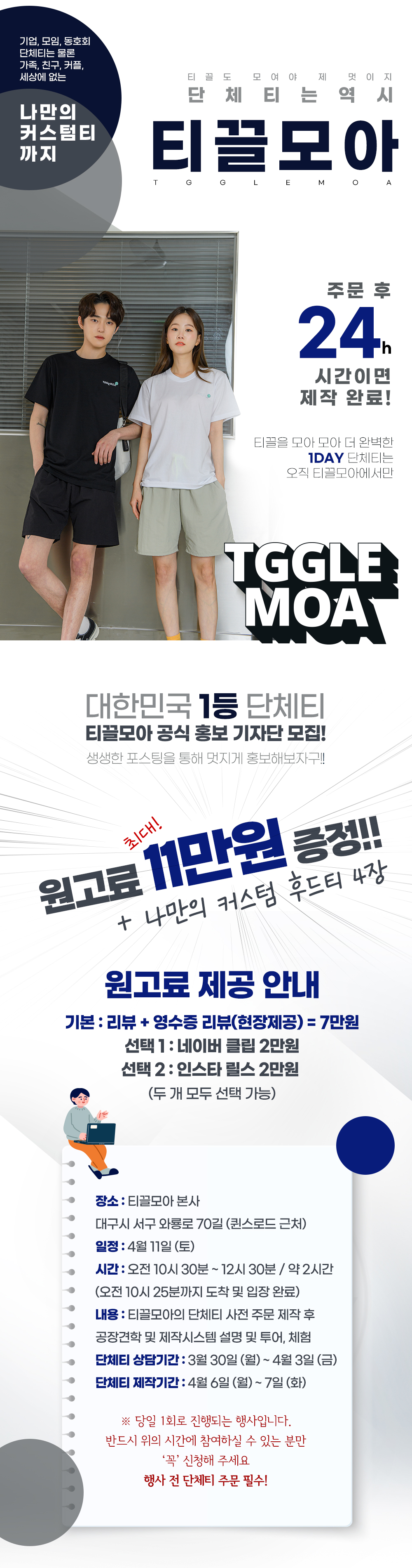 기업, 모임, 동호회 단체티는 물론 가족, 친구, 커플, 세상에 없는 나만의 커스텀티 까지 세상의 모든 티를 모아 모아 티끌모아 주문 후 24시간이면 제작 완료! 티끌 하나 없이 완벽한 1DAY 단체티는 오직 티끌모아에서만 Interview 티끌모아 최동영 대표, 김도연 실장 티끌모아에서 누구보다 빠르게 아무도 만나보지 못했 던 나만의 하나뿐인 커스텀 티셔츠를 만나보세요! 안녕하세요? 대한민국 최대, 최고의 단체 의류 전문 기업 티끌모아 최동영 대표입니다. 저희 티끌모아는 자타 공인 우리나라 최대, 최고의 단체 의류 전문 기업으로 가장 흔하게 접하실 수 있는 티셔츠부터 점퍼, 근무복, 액세서리, 반려동물의 옷까지 세상의 모든 옷과 다양한 인쇄 기술을 통해 나만의 커스텀 된 옷을 만나보실 수 있는 곳입니다. 티끌모아는 우리나라 제1의 섬유, 패션 도시인 대구에서 30년 넘는 시간 동안 의류 업계를 이끌어온 대구 대표 의류 기업인 PERPITTY&TWOROY의 장인 정신과 축적된 노하우를 이어 받은 청년들이 2016년 새롭게 문을 연 공간으로 단체 의류 업계에서는 독보적인 인쇄 시설과 제품 제작 공정 노하우 그리고 누구보다 젊고 창의적인 기업정신을 가지고 있습니다. 30년의 장인 정신을 계승하는 것은 물론 젊은 피를 도전적이고 창의적인 정신을 수혈해 더욱 발전시켜 고객을 위한 정도 경영은 물론 기존의 제작 공정을 더욱 발전시키고 확대해 단체 의류 전문 기업 중에서는 몇 안 되는 일원화된 최첨단 자동 제품 제작 공정을 구축하여 기존기성세대부터 MZ 고객까지 모두 만족하는 고객만족도 200%를 실현하였습니다. 티끌모아는 단순한 단체티, 의류를 넘어 제품에 고객의 이야기를 담고 그를 통해 고객의 시간을 행복한 추억으로 만들고 사람과 사람을 이어주는 매개체로 남으려 합니다. 소중한 사람들과 특별한 시간이 필요할 때 모두를 이어주는 역할을 티끌모아가 함께 할 수 있도록 항상 노력하고 또 노력하겠습니다. 감사합니다. chapter 1 ABOUT TGGLEMOA 장인의 검증된 탄탄한 기술에 MZ의 독창적인 생각을 더해 고객의 상상을 현실로 만드는 그것이 바로 티끌모아 티끌모아는 자체적으로 편직, 원단, 염색, 가공, 재단, 봉제부터 나염, 전사, 자수 등 인쇄까지 단체티 제작의 모든 공정 노하우와 제작 설비 시설을 갖춘 전직원이 20~30대의 MZ 세대로 구성된 ‘전국 유일의 단체티 전문 MZ 기업입니다’ chapter 2 The Philosophy of Tgglemoa ‘티끌모아의 철학’ 너와 나를 우리로 만들어주는 ‘티끌모아’ 티끌모아는 단순한 옷이 아닌 옷을 입고 마주할 여러분들의 소중한 시간이 아름다운 추억으로 남기 위한 도구로 마음껏 활용되길 바라는 간절한 마음으로 한 장의 추억을 만들어냅니다. 단순한 티셔츠가 아닌 사람과 사람을 이어주는 징검다리 바로 티끌모아의 철학입니다. chapter 3 The History of Tgglemoa ‘티끌모아의 역사’ 티끌모아는 우리나라 최고의 섬유, 패션 도시인 대구의 대표 의류 업체인 PERPITTY&TWOROY의 경영철학과 노하우 그리고 장인 정신에 청년의 젊고 패기 있는 창의적인 생각을 더해 역사와 전통을 지키고 세대와 세대를 이어가는 공간으로 지난 30여 년의 시간을 넘어 100년의 시간을 바라보는 국내 최대, 최초의 단체 의류 전문 기업입니다. PHILOSOPHY + HISTORY 고객만족 고객신뢰 고객우선 티끌모아는 3가지의 고객 정신에 30년의 시간을 넘어 100년을 바라보는 청년의 땀이 녹아있는 노력을 더해 티끌모아만의 헤리티지를 만들어냈습니다. 30 years + new generation = TGGLEMOA HERITAGE ‘티끌모아의 유산’ chapter 4-1 WHY TGGLEMOA ‘왜 티끌모아인가?’ 티끌모아는 제품 생산, 디자인, 인쇄, 검수 등 주문부터 고객에게 제품이 전달되기까지의 모든 과정이 외주가 아닌 자체 공장에서 이루어지기 때문에 일반 업체들에 비해 납기일이 빠르며 특이 상황 발생 시 신속한 대처가 가능합니다. 제품의 생산부터 디자인, 인쇄, 검수까지 한곳에서 이루어지는 단체티 제작 업체는 티끌모아가 유일합니다. ONLY one DAY ‘오직 티끌모아에서만’ 티끌모아는 업계 최대 규모의 최신식 자동화 기계 도입과 차원이 다른 유니티화된 제품 생산공정, 품질인증 시스템으로 단체티 업계에서는 유일하게 원데이 대량 단체티 주문이 가능합니다. 단체티 업계 유일, 최대의 규모의 자동화 인쇄 시스템 수동이 아닌 자동 시스템이라 실수 없이 더 빠르고 더블 코팅이라 더 선명하고 더 튼튼하게 티끌모아의 인쇄 시스템은 끊임없는 R&D를 통해 사람 손으로 진행하는 수동 인쇄가 아닌 디지털로 계산된 자동화된 최신 인쇄 시스템 구축해 티끌모아만의 인쇄 노하우로 오류 없이 균일하며 빠른 인쇄가 가능합니다. 나염 인쇄의 경우 더 높은 고객만족도를 위해 추가 금액 없이 더블 코팅이 기본적으로 진행되어 더욱 선명하고 내구성이 높은 결과물을 만나볼 수 있습니다. 무조건 한번 더! 더블 코팅이 기본인 곳은 오직 ‘티끌모아’뿐 chapter 4-2 세상의 모든 티에 세상의 모든 인쇄를 더하다. 티끌모아는 티셔츠, 점퍼, 조끼, 근무복부터 모자, 액세서리, 아동 및 반려동물까지 착용 환경과 목적에 맞는 다양한 핏과 기능을 가진 30여 가지 카테고리의 수백 종이 넘는 다양